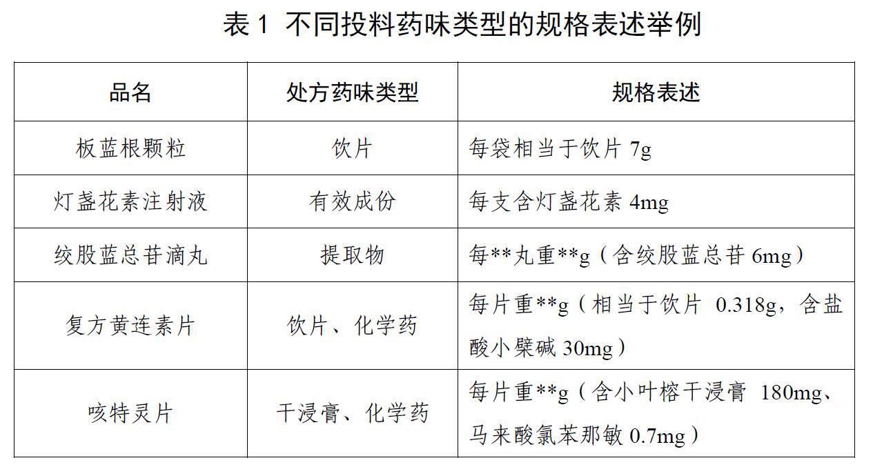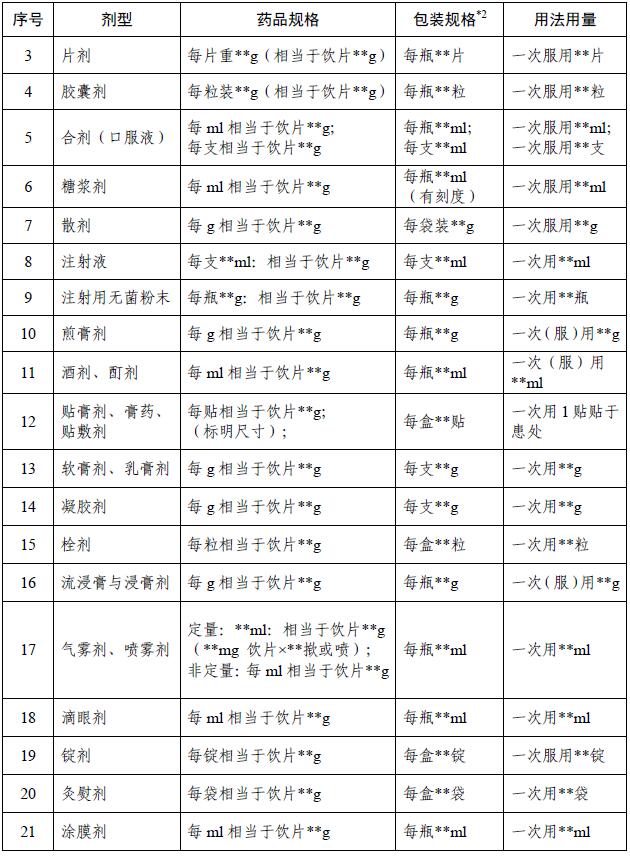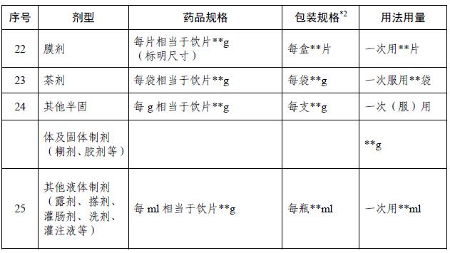 *1:表中药品规格的表述以处方药味均为饮片为例。 *2:表中的包装规格仅表示最小包装的规格,也可视为装量规格。