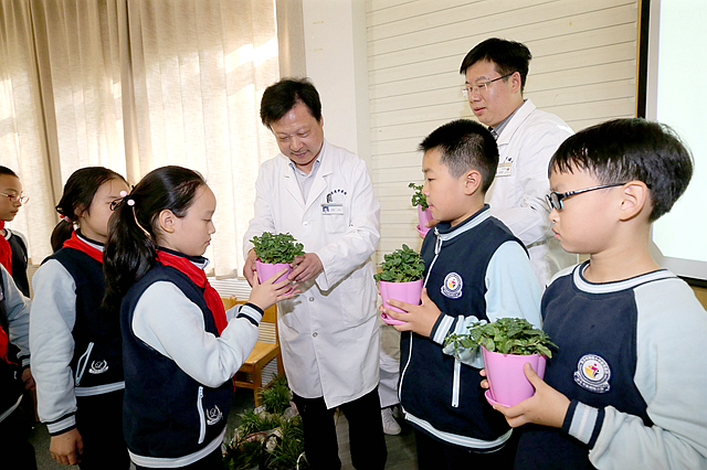 江苏省中医院医生向小学生赠送药用植物薄荷。 王光正/摄