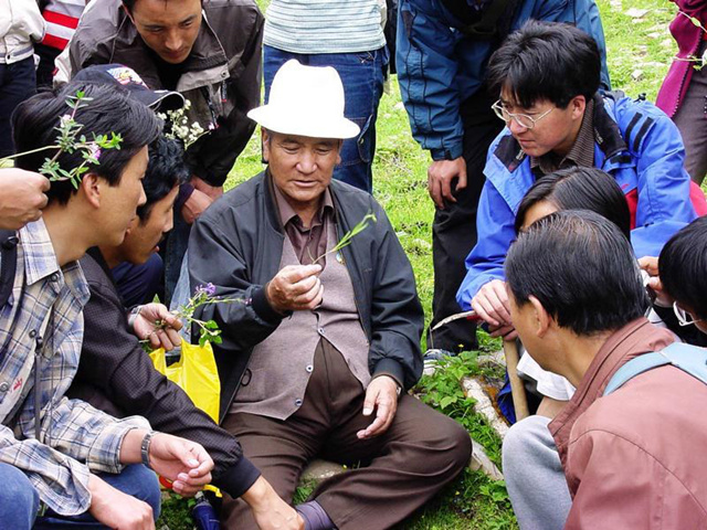 尼玛在海拔3800米的青海互助北山为学生传授藏药材识别经验。