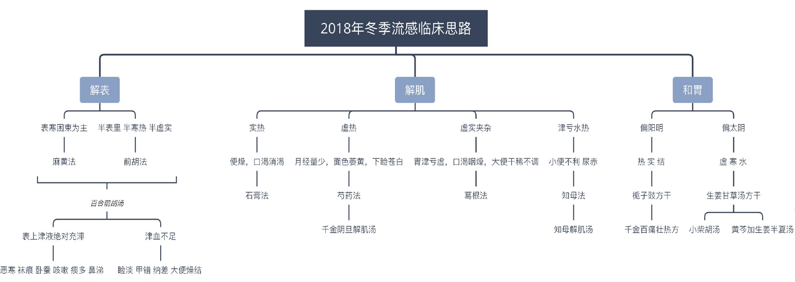 此次流感,很多患者发热、恶寒比较明显,或伴眼睑红鲜,肢体酸沉困痛,代表人体表位的津血充滞明显;同时下肢袜痕,目下卧蚕,咳嗽,痰多,鼻涕,喷嚏,为上焦和人体的表位充滞着风寒和水饮,类似“溢饮”“风水”,这种情况是麻黄剂的应用范畴。本次流感,解表往往多选麻黄剂或者麻黄配前胡;而里的层面,此次患流感的患者在病程中常伴有口干口苦,甚至口渴饮多,部分患者伴有大便秘结、小便频或者大便稀溏的表现。若用麻桂攻表,则可能加重里热,使热势反复。这就要求我们细分在里津液的虚实、寒热,灵活选用适合体内津液状态的方法,使表邪得以充分透解,而不至于加重里虚或者里热的情况。