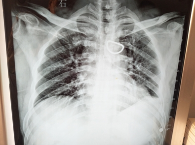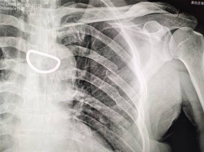 左锁骨外1/3骨折、左肩胛后中线5、6、7肋骨骨折、移位明显。(复位前)