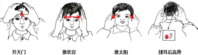 推太阳:用拇指桡侧分别在左右两太阳穴处向后直推20~30次。