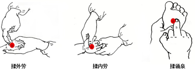 常揉外劳宫穴具有温阳散寒、升举阳气的作用;内劳宫及涌泉穴,俗称手足心,对小儿而言,常揉手足心有避风寒的作用。