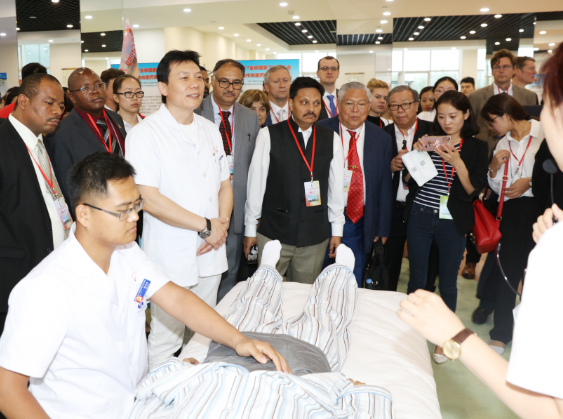 王金贵(左二)在2017年金砖国家卫生部长会暨传统医药高级别会议活动中向国际友人介绍津沽脏腑推拿。