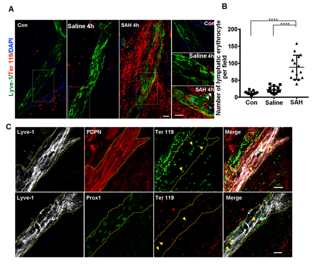 出血是一种常见的病理现象,但是至今为止,出血后血细胞的清除机制仍然不是十分清楚。淋巴管系统具有回流大分子蛋白和免疫细胞的作用,但是,淋巴管系统是否参与血细胞的清除过程仍是未解之谜。蛛网膜下腔出血是脑底部或脑、脊髓表面的血管发生破裂、血液直接流入蛛网膜下腔引起的急性综合征,临床表现为剧烈头痛、呕吐、脑膜刺激征和血性脑脊液。其发生年龄早、死亡率和致残率高、临床预后差。因此,清除血细胞可能有助于减轻蛛网膜下腔出血造成的病理损伤。硬脑膜淋巴管表达与外周淋巴管内皮细胞同样的表面抗原,具有回流脑脊液中的大分子物质及免疫细胞到颈部淋巴结、参与中枢神经系统免疫调节等功能。但是硬脑膜淋巴管是否可以回流脑脊液中的红细胞尚不清楚。