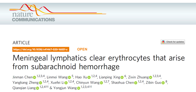 在《自然通信》杂志发表的“脑膜淋巴系统清除来自蛛网膜下腔出血的红细胞”的文章。