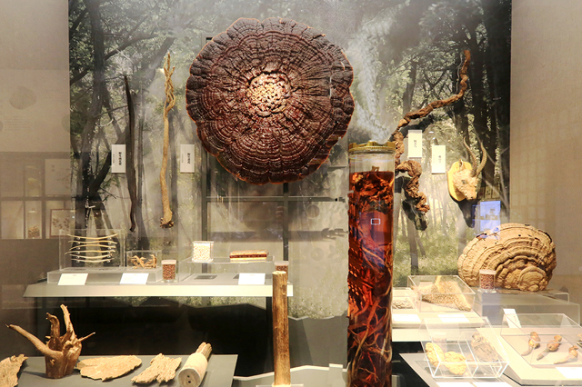 中药馆位于博物馆三层,从一面名为“花药馨香”、由百余种药用花卉组成的花墙开始,整个“中药馆”展厅内,植物药、动物药、矿物药一应俱全——直径达105厘米的灵芝,生长脉络和纹理清晰可见;高约180厘米、宽约120厘米的特大肉桂皮标本香气馥郁……走遍展厅,如同置身大自然,记住了百味甘苦,体会到“天人合一”。其中的动物展示区以立体仿真生态园林的形式,将展品组合呈现,给参观者以场景感和美感,成为吸引人们驻足停留最多的地方。展品中很多珍稀动物药如犀角等,如今在中医临床已不再使用,仅作为中医药历史讲给参观者听。