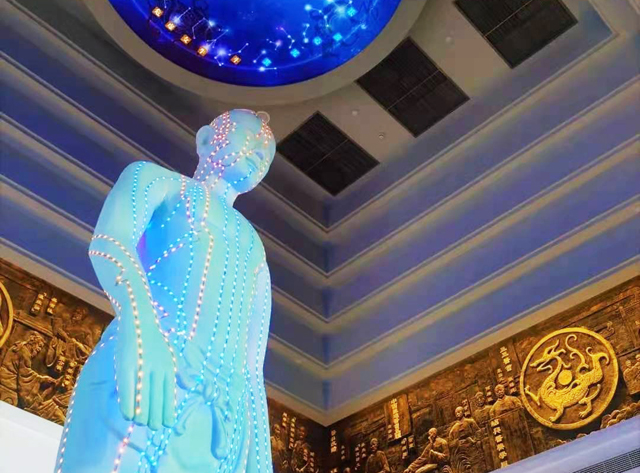 走进浙江中医药博物馆一楼大厅,迎面是一方体现“天地人文”的景观:一尊4.5米高的“针灸铜人”伫立大厅中央,和其他铜人不同,它通体白色,身上经络发着蓝色、红色的光,炫酷十足。抬头仰望,头顶上一方苍穹,模拟逼真的电子古星象图星光闪烁,28星宿环布周天,北斗围绕北极流转。“铜人”脚下是先天八卦台,对应着大地八方。“天地人”三才及中医“天人合一”的核心思想,在这一场景中得到展现。