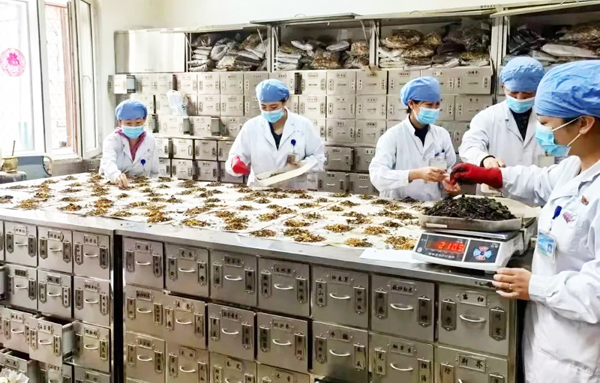 黑龙江省哈尔滨市中医医院药剂科的工作人员在加班调配中药。
