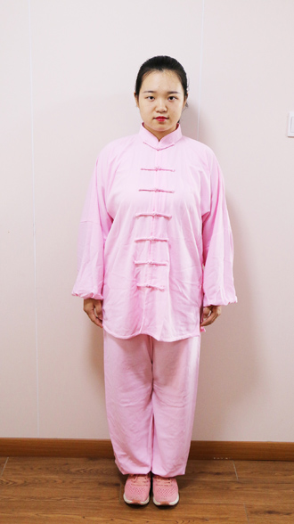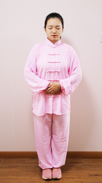 调身:两脚并拢,自然站立,两臂在体侧自然下垂,舌尖轻抵上腭(口中如有津液产生,咽下,不要吐掉)(图1)。
