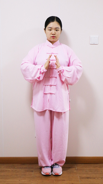 调身:两手掌心相对,在胸前膻中穴附近做开合拉气数次。注意两肩、臂和手放松,不要耸肩(图5)。