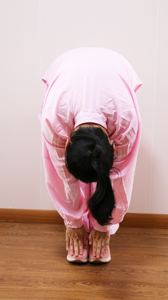 调身:两腿伸直,两手经体前捧气上升,按于两肋,指尖相对,两手向后摩运,按于腰部;头后仰,尾骨上翘,挺胸收肘,停留几秒钟后缓缓摆正。身体从上到下慢慢前俯,两手顺势沿腰臀部、双下肢后侧下至足跟部摩运,再向前贴于足尖,做收腹拱腰头面贴腿的动作三次(图4)。随后从下到上缓缓伸直腰背,双手上升,按于两肋。如此重复数次。