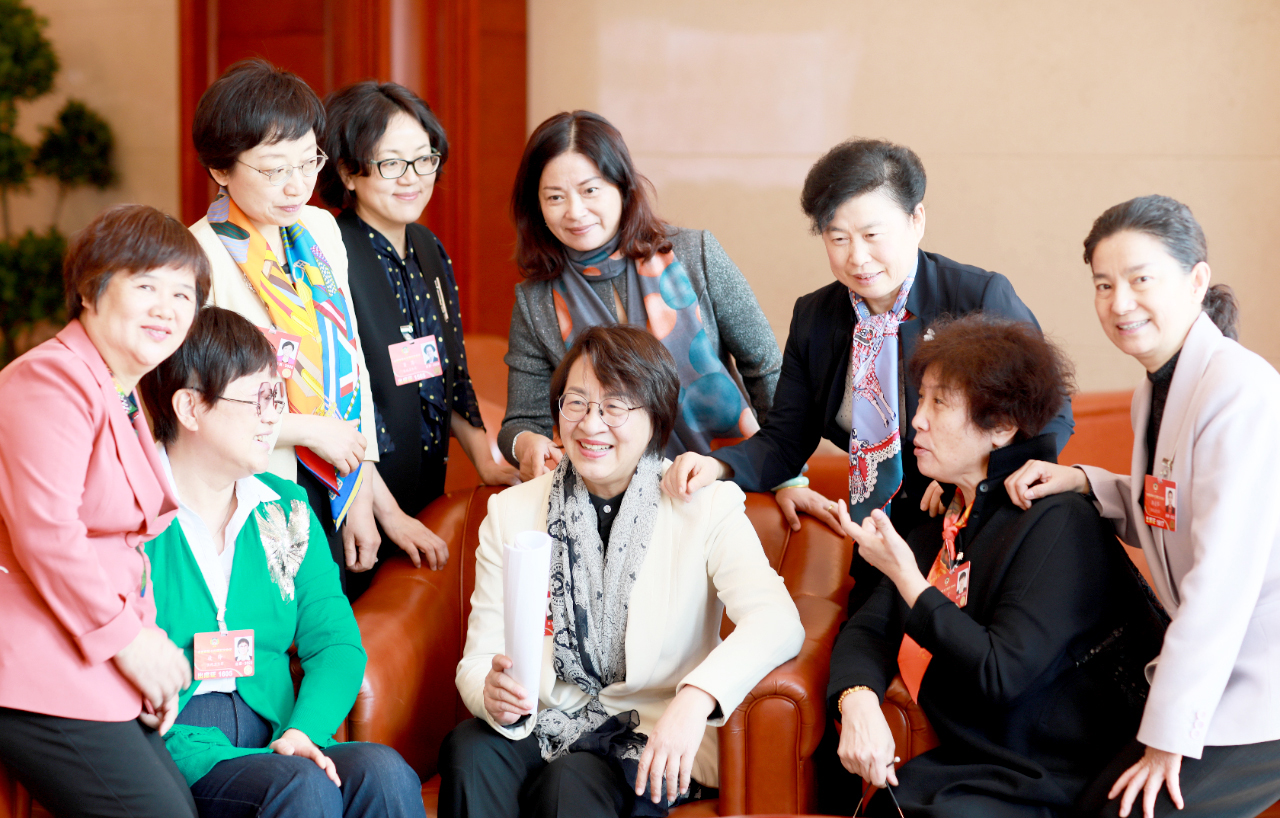 3月8日是“三八”国际劳动妇女节,医药卫生界女代表委员们:杜丽群(前排左一)、凌锋(前排左二)、杨宇飞(前排中)、王宜(前排右二)、韩清华(前排右一)、肖新月(后排左一)、肖冉(后排左二)、马骏(后排右二)、李萍(后排右一)在会场上热议政府工作报告。