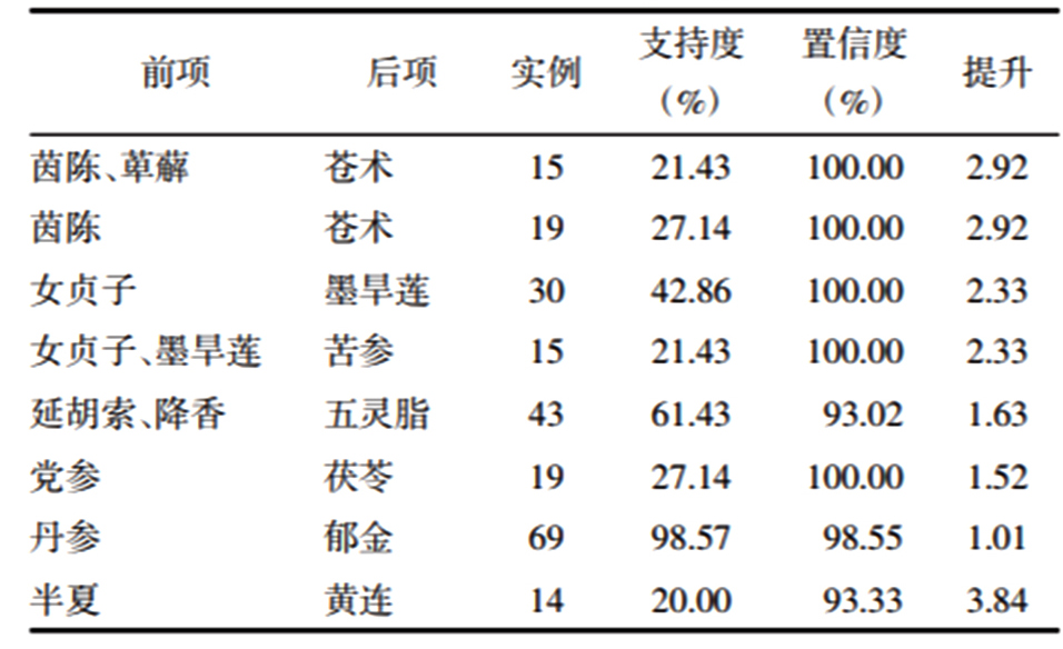 用药关联分析对处方中出现的113种中药(除出现频率达97%的丹参、郁金)进行中药配伍关联分析,规定最小支持度为20%,最小置信度为85%,最大前项数(中药数)为2,得出121条关联结果,部分结果见下表。