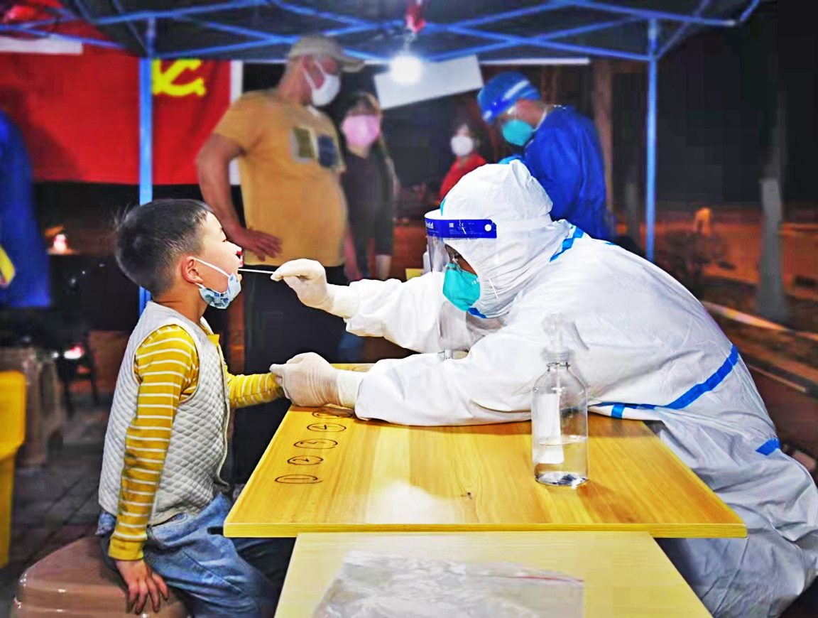 “请大家佩戴好口罩,排好队,保持一米以上的安全距离……”在检测现场,志愿者们穿梭于人群中,维持秩序、登记信息、引导群众扫描二维码、耐心为群众解答注意事项等,从白天到黑夜,他们几乎一刻不停,分秒必争。为了节约时间,医疗队队员和志愿者们几乎不喝水,由于防护服密不透风,他们常常需要忍受着闷热,维持着十几个小时的高强度工作,即使嗓子喊哑了,胳膊抬不起来,他们也仍然坚守在岗位上,从没人喊累。