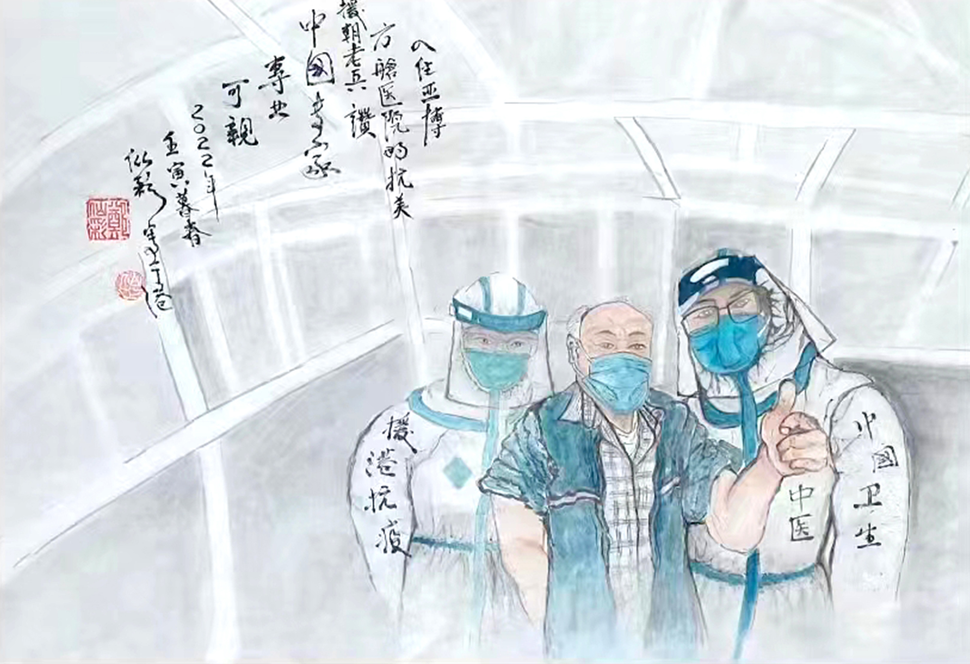 这位昔日的老兵,称赞他们是今天抗疫战场的英雄。为表达感激之情,何敦夫出院前送给他们一幅画,画中,他和两名医护人员站在一起,竖起大拇指为中医药点赞。