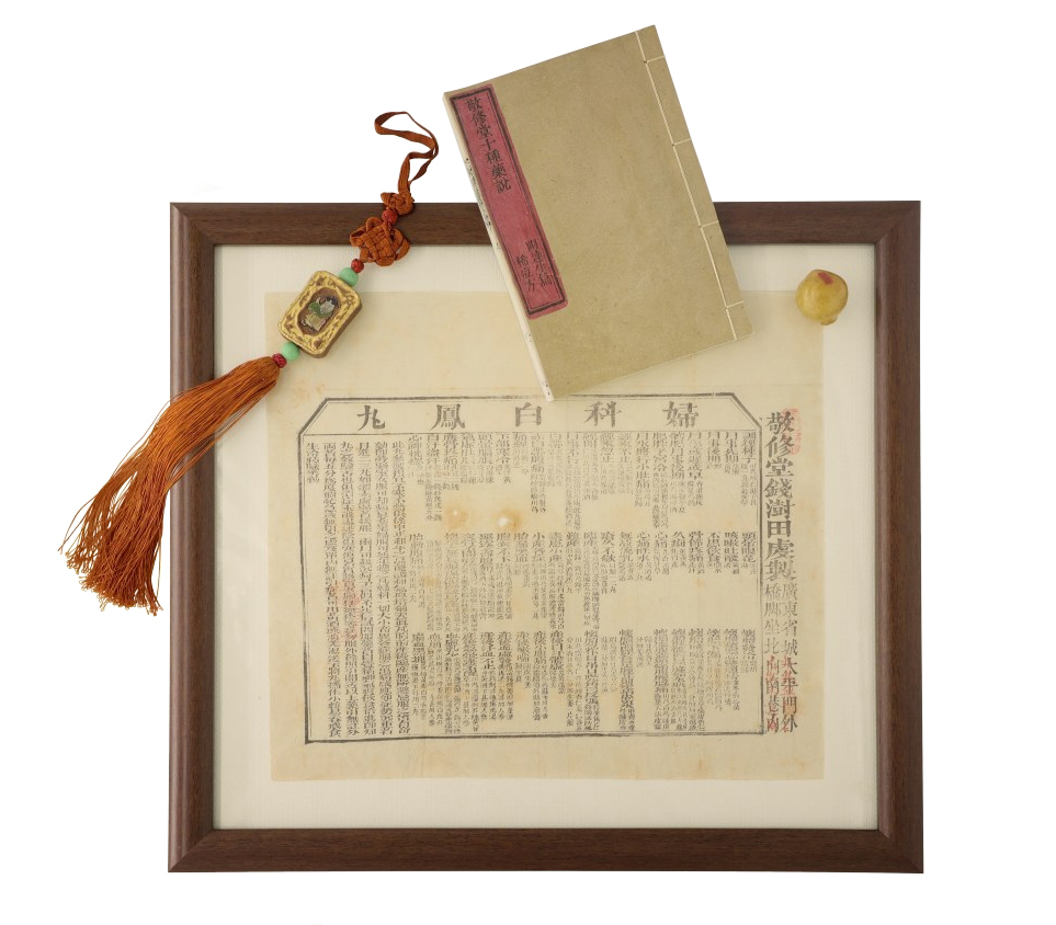 与妇科白凤丸一同发现的,还有敬修堂妇科白凤丸的仿单。仿单相当于现代的药品说明书,上面清晰记载了敬修堂妇科白凤丸的用途、生产地址、历史等信息,“敬修堂钱澍田虔制”“广东省城太平桥门外”数个大字赫然印在仿单上,亦恰恰印证了妇科白凤丸那段进入皇宫的辉煌历史及其背后关于敬修堂的厚重故事。