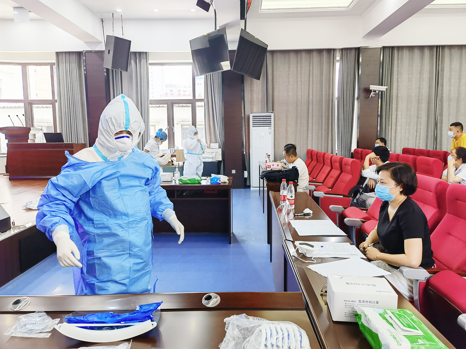 国家中医疫病防治队在进行穿脱防护服考核。