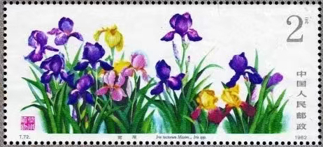 1982年5月20日,我国邮电部门发行了T72《药用植物(第二组)》特种邮票,设计者为邹建军。其中小型张的图案就是鸢尾。其花色或是紫蓝色,或是明黄色,或者淡粉色,明艳动人。在邮票画面的左下角有“药用植物”篆刻印章一枚。