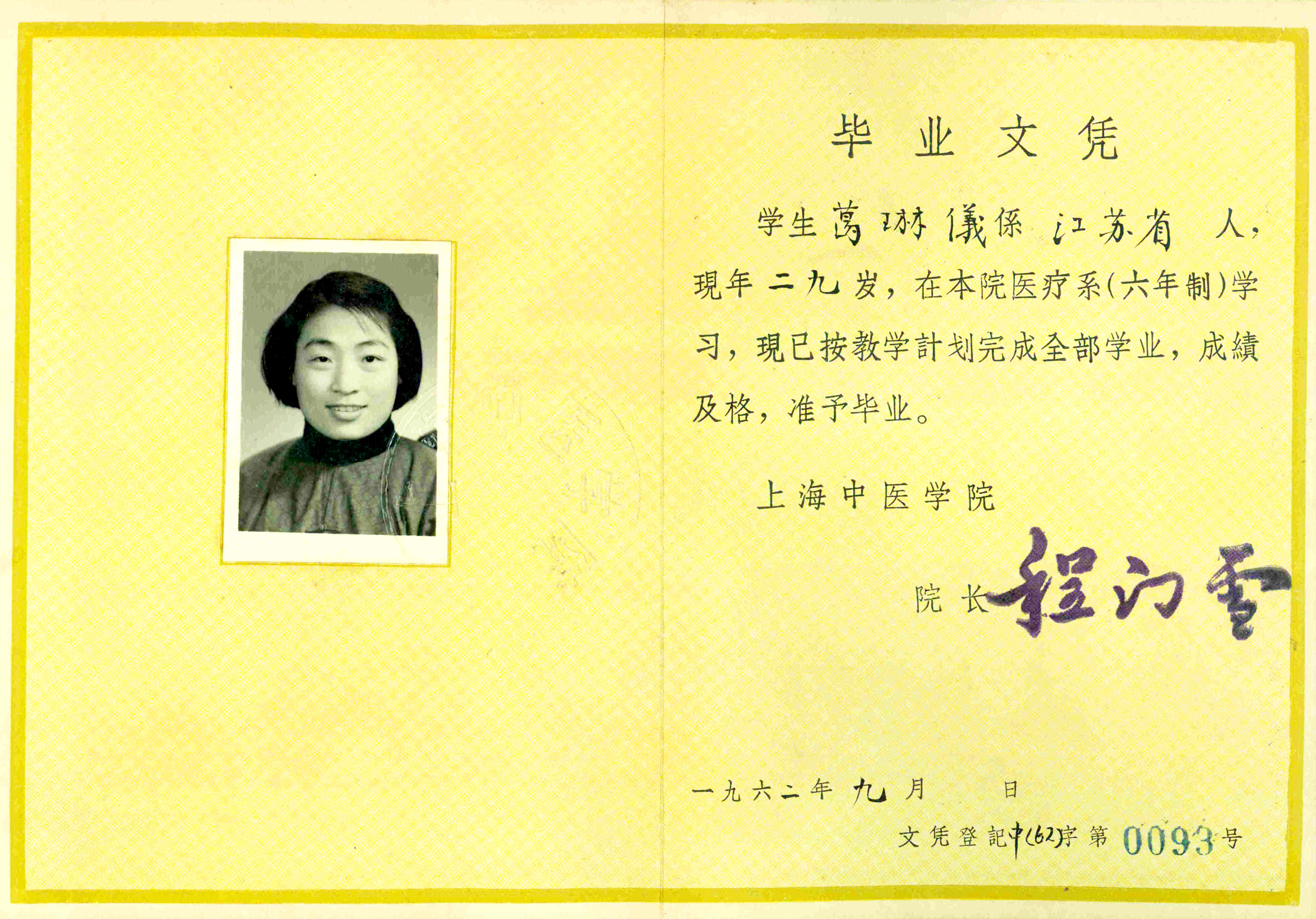 1962年,葛琳仪毕业于上海中医学院(现上海中医药大学),图为毕业证书。