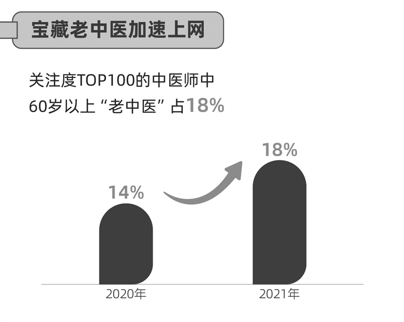 报告显示,在2021年关注度TOP100中医师中,60岁以上中医师人数占比由2020年的14%提升至18%。