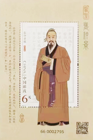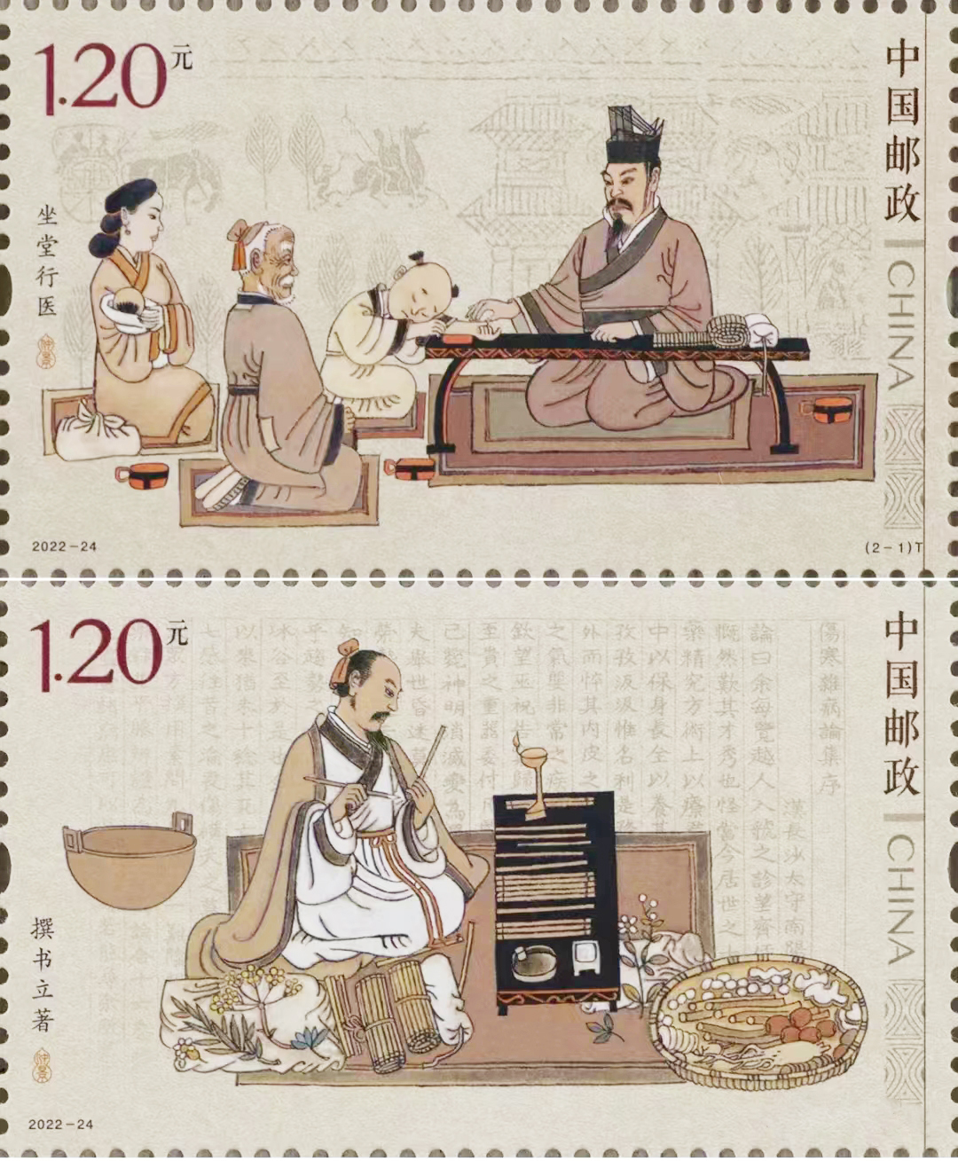 10月22日为世界传统医药日,今年中国邮政发行《张仲景》特种邮票1套2枚、小型张1枚,图案名称分别为坐堂行医、撰书立著、张仲景像。设计者是中央美术学院教授刘金贵。