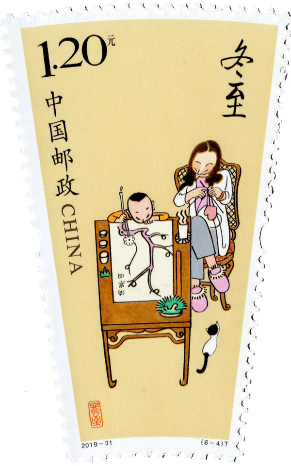 2019年11月8日,中国邮政发行了《二十四节气(四)》特种邮票一套六枚,分别对应立冬、小雪、大雪、冬至、小寒、大寒这六个冬天的节气。该套邮票由中央美术学院教授刘金贵和著名邮票设计师王虎鸣设计,北京邮票厂印制。“冬至”邮票作为其中第四枚,表现了小孩子在家中绘制《消寒图》的情景。