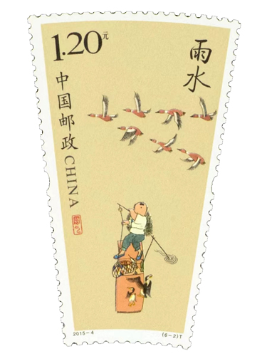 2015年2月4日,中国邮政发行《二十四节气(一)》特种邮票一套六枚,由刘金贵和王虎鸣设计。其中第二枚描绘的是雨水节气。雨水节气有三候:一候獭祭鱼,二候候雁北,三候草木萌动。邮票画面描绘的就是渔人泛舟,带着鱼鹰下水捕鱼,大雁排成人字形在天空飞的场景。