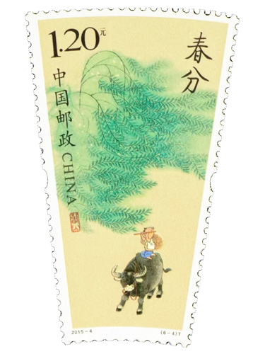 2015年2月4日,中国邮政发行《二十四节气(一)》特种邮票一套六枚,由中央美术学院教授刘金贵和著名邮票设计师王虎鸣设计。其中第四枚描绘的是春分节气,画面上,翠柳青青,柳絮纷飞,放牛郎骑在牛背上,吹着悠扬的笛声,怡然自得。