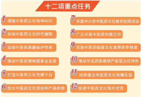《方案》明确了12项重点任务,包括挖掘整理中医药蕴含的中华文化内涵元素,加强研究并凝练中医药文化精神标识;鼓励引导对中医药文化内涵理念进行时代化、大众化、创新性的阐释,推出一批面向不同受众的精品图书和数字读物;充分发挥中医药典籍的文化载体作用,系统保护、研究和利用中医药古籍;推动中医药博物馆事业发展,加强中医药博物馆和文化场馆建设;打造中医药文化传播平台,遴选建设中医药文化宣传教育基地和中医药文化体验场馆,加大对传统医药类非物质文化遗产代表性项目保护传承力度;加大中医药文化活动和产品供给,每年度打造一组中医药文化传播专题活动,支持中医药动漫精品创新,引导中医药题材文艺作品创作;丰富中小学中医药文化教育校园活动,引导学生了解有关中医药文化的常识;广泛开展中医药科普工作,方便群众便捷获取正确、规范的中医药养生保健知识;实施中医药健康文化素养调查制度,为中医药健康文化的传播推广提供数据支撑;推动中医药医教研产彰显文化特色,加强对中医药从业人员文化熏陶,将中医药文化融入现代生产生活;培养建立中医药文化传播队伍,构建能力突出、结构合理、梯次分明的人才体系;促进中医药文化海外交流,提增中医药在海外认可度和接受度。