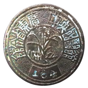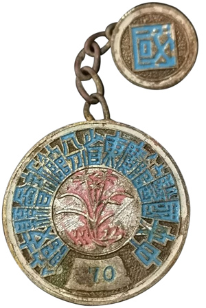 第四枚:“中央国医馆广东省分馆新会县支馆”(图④)。这枚章与上述广东省分馆章同出一辙,也是直径2.4厘米,合金烤漆质地。正面圈读“中央国医馆广东省分馆新会县支馆”,下方有编号“70”,中央区域同样有一株兰花。烤漆尚有残存,蓝字、红花。背面有“馆员证光复北大成制”字样,与省分馆章是同一家作坊出品。此章的独特之处是挂链上有一个圆形的“国”字扣,这也是民国时期徽章的一种式样,往往为了突出主章的核心内容。一个“国”字,凸显了“国医”。新会是出产正宗“广陈皮”的地方,现为广东省江门市新会区,中医药底蕴深厚。新会县支馆成立于1932年7月16日,馆长为黄焯南。该馆曾向社会募捐开设了治疗所,开展赠医施药活动,并附设救护队,还组织了医药研究委员会进行学术整理;同时,积极参与地方中医药行政管理工作,取得了一定成效。章上“70”字样,说明当年新会县为国医馆服务的人数至少有七十人,规模不算小。