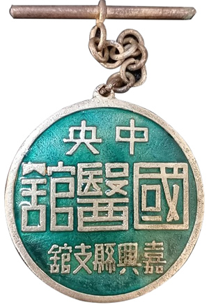 第二枚:“中央国医馆嘉兴县支馆”(图②)。直径3.0厘米,质地为银质珐琅。正面字体阳刻,湖绿色珐琅完好无损,似一汪深潭,意境深远。背面有“九州20”字样,说明是当地九州银号打制的,佩戴者编号20。这是一枚民国时期比较流行的挂链式徽章,字体质朴,艺术感强。浙江省嘉兴县支馆成立于1936年8月7日,陈骏八任馆长。