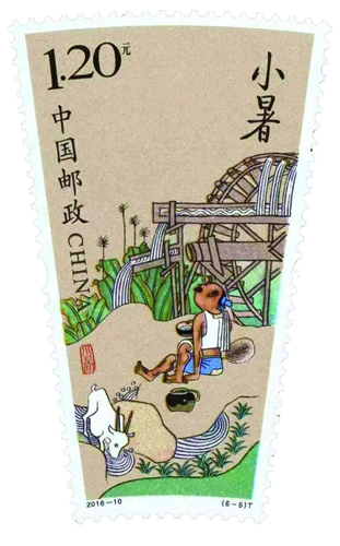 2016年5月5日,中国邮政发行《二十四节气(二)》特种邮票一套6枚,由中央美术学院教授刘金贵和邮票设计师王虎鸣设计。其中第五枚图案是小暑,描绘了农作物生长繁茂、田间水车灌溉的场景。画面中间有一个小男孩,身穿夏衣,双脚赤裸。画面下方还有一只山羊在饮水,暗示天气特别热。
