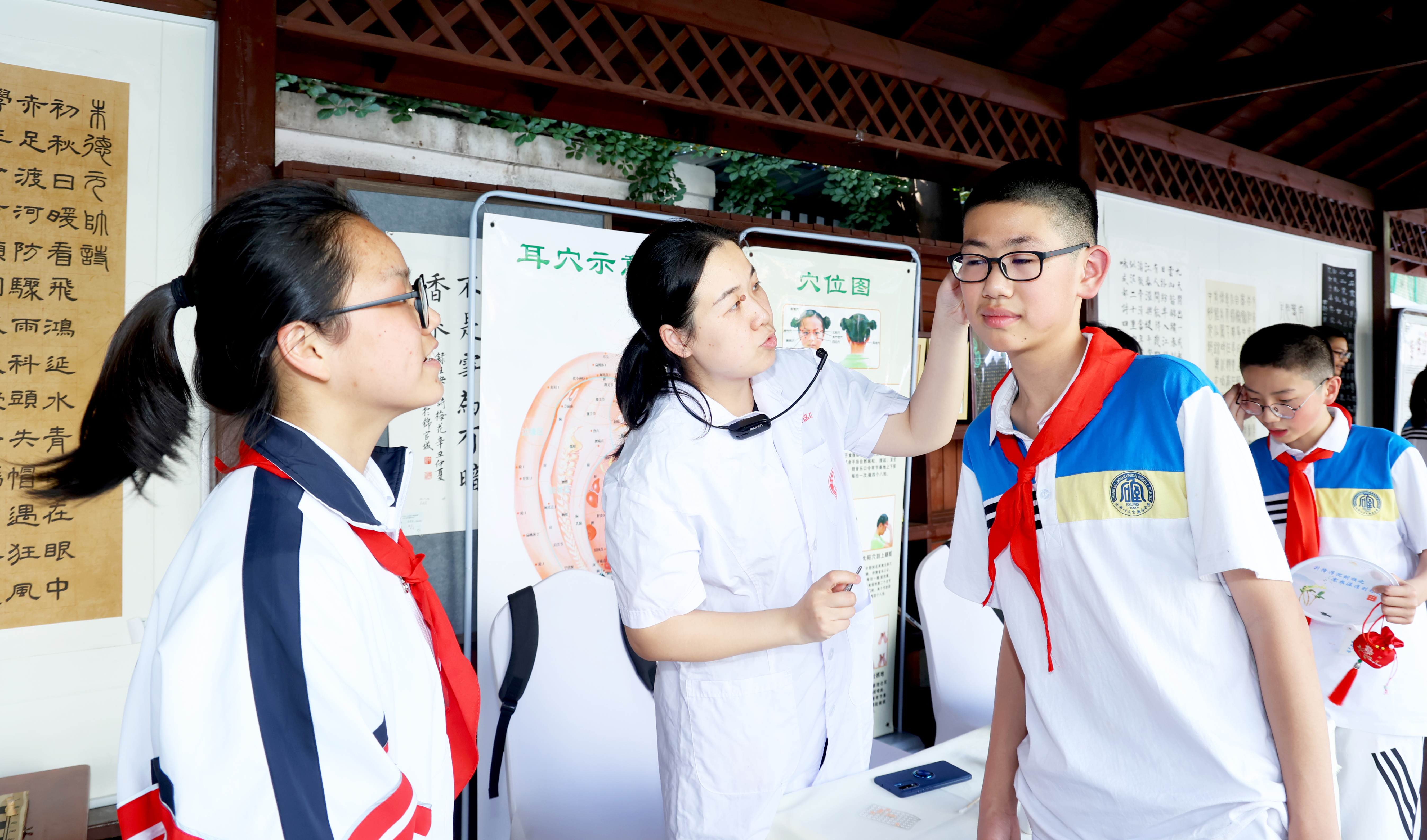 成都市青羊区中医医院中医师齐丹丹为学生们进行耳穴压豆治疗,刺激耳部穴位防控近视。