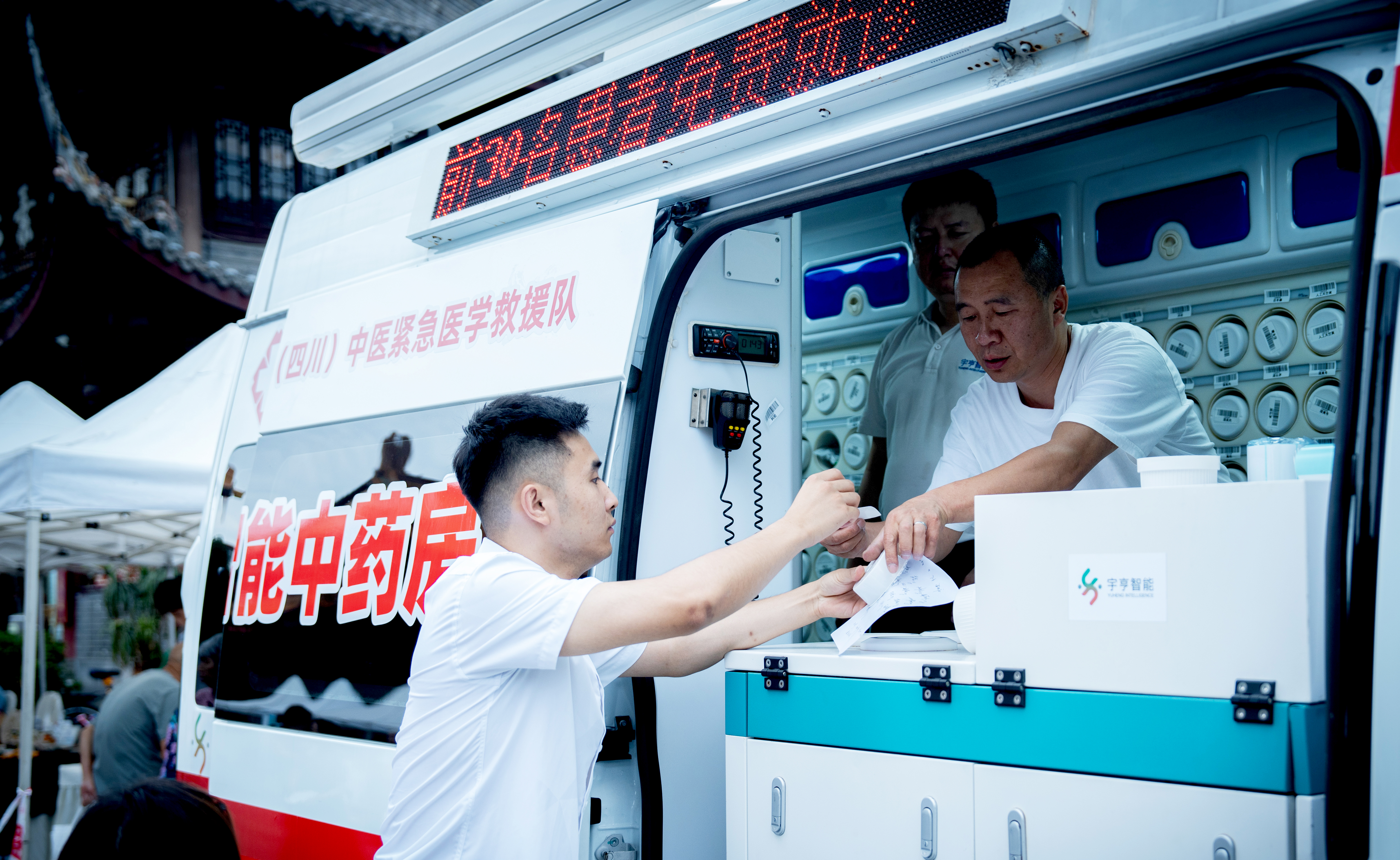 在成都市暨温江区中医药文化宣传节上,市民在“流动应急智能中药房”车辆现场取药。