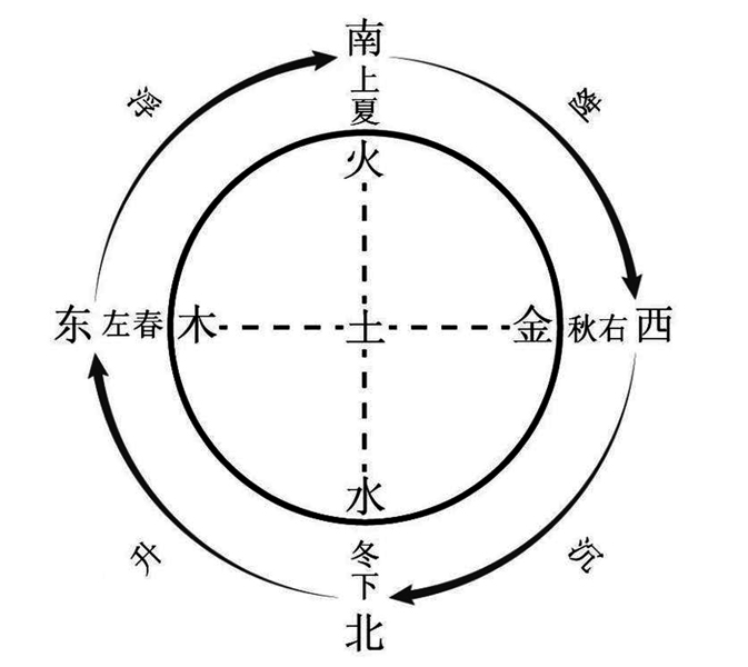 《素问·天元纪大论》指出:“太虚寥廓,肇基化元,万物资始,五运终天,布气真灵,揔统坤元,九星悬朗,七曜周旋。”医中先哲昼参日影,夜考极星,总结天地之气的运行规律,而后始有中医学。《黄帝内经》多篇涉及“圆运动思维”,而《素问·四气调神大论》尤为显著。中医同道多认为此篇主要探讨四时养生理论,然笔者认为,其学术价值在于借助“春、夏、长夏、秋、冬”之“生、长、化、收、藏”等特性,彰显“阳气圆运动”之理(如四季阳气圆运动图所示)。