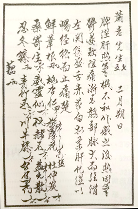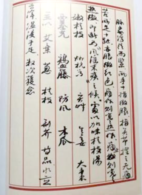 全当归三钱,甘菊花二钱,鸡血藤四钱,炒白芍三钱,酒川芎二钱,海风藤六钱,枸杞子四钱,桑叶枝三钱、八钱(可能是桑叶三钱,桑枝八钱),宣木瓜三钱,寻骨风八钱,炙甘草五钱。徐景藩拟方(出自林乾良《中国古今名医处方真迹集珍》)