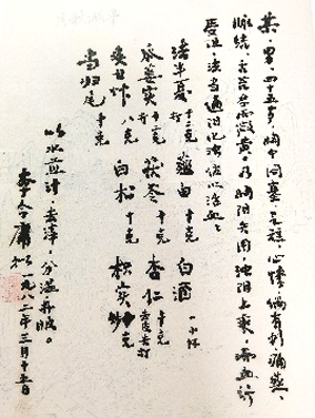 法半夏12克(打),薤白10克,白酒一小杯,瓜蒌实12克(打),茯苓10克,杏仁10克(去皮尖、打),炙甘草8克,白术10克,枳实10克(炒),当归尾10克。以水煎汁,去滓,分温再服。李今庸拟一九八二年三月十五日(出自林乾良《中国古今名医处方真迹集珍》)
