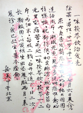 茯苓一、二斤,为细末,每服二钱,白开水送下,日二次。长期服用,以发根生出为度。服两月,来复诊。发已丛生,基本痊愈。岳美中于北京(出自林乾良《中国古今名医处方真迹集珍》)