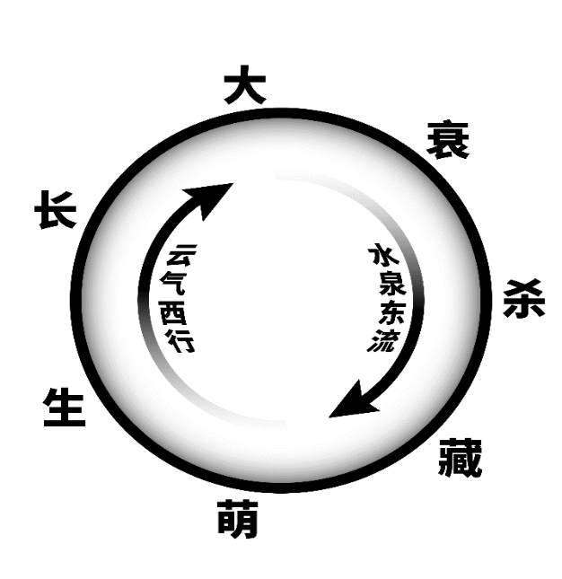 圜(yuán),通“圆”,圆形之意。又名圜(huán),通“环”,环绕之意,我们可以称之为圆运动。这个圆运动周而复始、循环往复,古称“圜道”。万物皆秉此道,万物都有动、萌、生、长、大、成、衰、杀、藏之圜道。只要有生有灭就有圜道,万物皆有生灭,故万物皆有圜道。从生命到宇宙、从星球到原子,无不有生有灭。生即“动则萌,萌而生,生而长,长而大,大而成”;灭即“成乃衰,衰乃杀,杀乃藏”。从生到灭即是圜道。如果从生到灭是圜道的一次循环,那么万物,或如四季轮转、昼夜循环,这是循环往复之圜道;或如生命,通过种子和遗传基因完成生命的不断繁衍,这是循环往复之圜道;或如生命的新陈代谢循环往复,细胞的不断凋零不断再生,这是循环往复之圜道;或从一种物质转化为另一种物质但能量依然守恒,能量在不断转化中依然如圜道般循环往复,这是循环往复之圜道。生灭的过程即是圜道,万物皆有生灭,并以不同的形式进行着圜道的循环往复、周而复始,太极图以此为基础,故曰太极圜道。