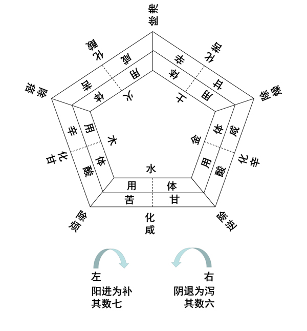 从形式上看,《汤液经法图》属于五边形结构,对称严谨,以顺时针顺序展示了木火土金水的相生循环,与地球生态一年四季的阴阳变化相符合。从内容上看,《汤液经法图》展示了一套以五脏虚实辨证+五味补泻治疗为框架的辨证论治体系,根本上还是属于脏腑辨证的内容。例如,该图在左下角的肝木区域标有辛、酸和甘3种药味,结合《辅行诀》原文可知,“肝德在散,以辛补之,以酸泻之,肝苦急,急食甘以缓之”。这就说明,在肝木疾病的治疗上,辛味药补肝用于肝虚,酸味药泻肝用于肝实,而甘味药缓肝,既可用于肝虚亦可用于肝实。其余脏腑同理。