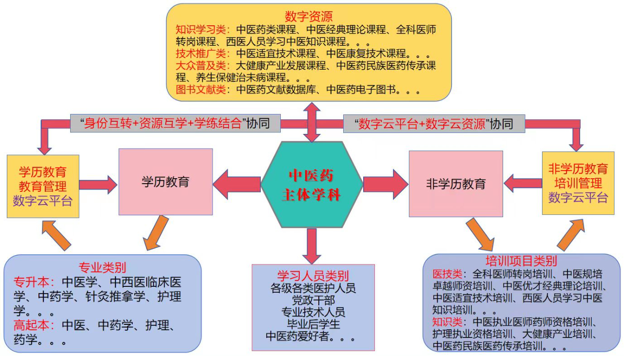 在非学历教育方面:中医药教育的目标是培养医技类和知识类人才,依托中医药主体学科的特色优势,构建了“多类型、多层次、多专题”的线上线下结合的多元化培训模式。这种模式为基层培训了大量中医药技能人才,满足了社会对中医药专业技能的需求。