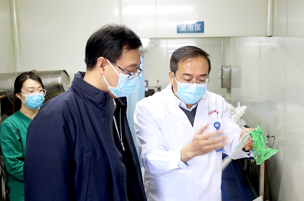 包献华(左)调研中医医院,医院党委书记彭建峰(右)做介绍。