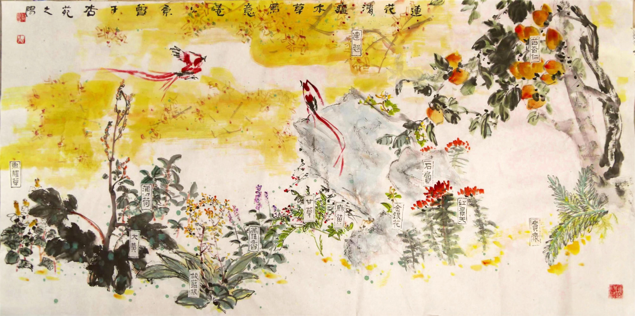 画面自右上向左下依次为贯众、红景天、石膏、金银花、麻黄、甘草、广藿香、板蓝根、薄荷、大黄、鱼腥草。后排为杏仁、连翘。因为连花清瘟方中首味药是连翘,故虽然连翘属灌木较矮,但在图中仍置于杏树之上方,以显示其在方中的领军地位。此外,图中13味本草集聚一堂,易生沉闷感。恰巧连翘早春盛开,先花后叶,满目金黄,美艳绝伦。今借黄色花海渲染情形势之急迫。再添两绶带鸟以祝祛病康复、延年益寿,兼能拉动画面营造气氛。还有,为平抑连翘花色温过热,将淡青色大块石膏居中安放,以不失连花清瘟宣泄肺热之要义。(刘景曾 青岛市卫生健康委杏林书画院)