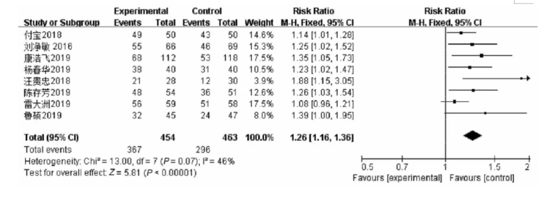 3.2术后TIMI血流分级 8个研究报道了治疗后TIMI血流分级指标,共917例,异质性检验提示各研究间无异质性,Meta分析使用固定效应模型执行。结果显示,试验组患者治疗后TIMI血流分级高于对照组,差异具有统计学意义(图1) 。