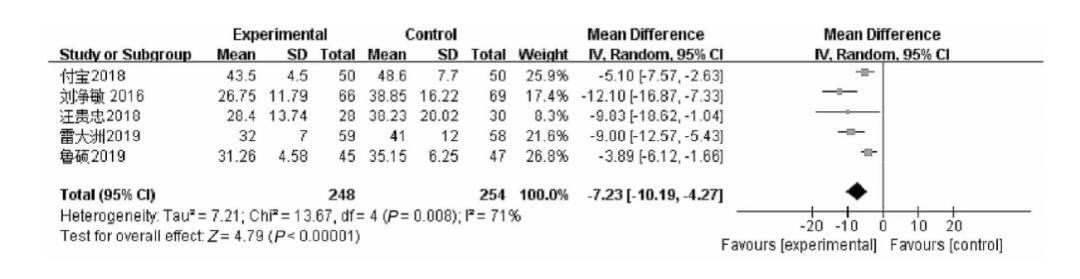 3.3术后校正的TIMI帧数 5个研究报道了治疗后cTFC指标,共502例,异质性检验提示各研究间有异质性,Meta 分析使用随机效应模型执行。结果显示,试验组患者治疗后cTFC 低于对照组,差异具有统计学意义(图2)。