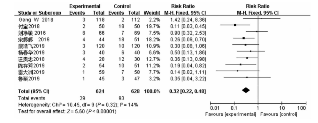 3.7 术后1个月内主要不良心血管事件 10个研究报道了治疗后1 个月内MACE,共1252例,异质性检验提示各研究间无异质性,Meta分析使用固定效应模型执行。结果显示,试验组患者治疗后1个月内MACE发生率低于对照组,差异具有统计学意义(图4)。