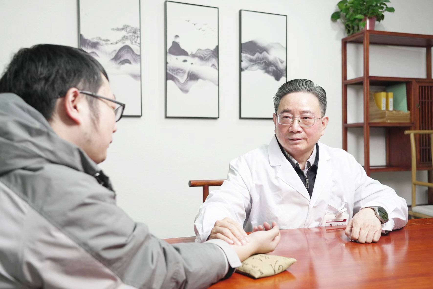 李庆海(右)在为患者诊脉。