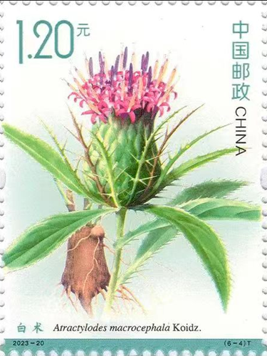 中国邮政于2023年10月发行《药用植物(三)》特种邮票一套6枚,由余天一设计。第四枚为白术,描绘了菊科苍术属植物白术的头状花序,小花紫红色,叶片为倒披针形或长椭圆形;背景为其粗大的根茎,是为药用部位,略呈拳状,外表灰黄或灰粽色。