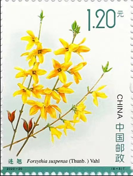 中国邮政于2023年10月11日发行《药用植物(三)》特种邮票一套6枚,由余天一设计。第五枚为连翘,以科学画的形式描绘了木樨科连翘属落叶灌木连翘的植株,花为黄色,呈四瓣,先于叶开放。左下角描绘了两枚卵状椭圆形的果实,喙状先端已开口,这便是连翘的药用部位。